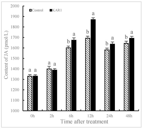Time courses of jasmonic acid level of S. miltiorrhiza hairy root. The roots treated with KAR1 were harvested at determined time points. JA contents of the root were then determined. Data are means of three replicates ± SD. Different letters indicate significantly different values according to one-way ANOVA followed by Tukey’s test (p < 0.05).