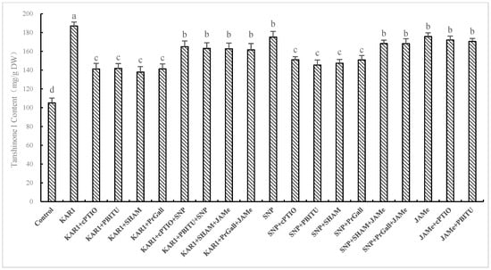 It has been exhibited in our experiments that NO generation and production of JA were early events in hairy root of S. miltiorrhiza responding to KAR1. Whilst little information about whether NO and JA participated in KAR1-induced accumulation of T-I has been known. So we investigated the influence of scavengers and inhibitors of JA and NO on production of T-I induced by KAR1. As displayed in Figure 6, cPTIO and PBITU significantly (p < 0.05) suppressed the increase of T-I induced by KAR1, suggesting that KAR1-induced accumulation of T-I through NO pathway. Treatments of SHAM and PrGall induced a decline in T-I level, indicating that JA plays a signal part in KAR1-induced increase of T-I. These results were verified by the finding that the suppression of inhibitors of JA and NO on increase of T-I induced by KAR1 were turned back by treatments of JAMe and SNP (Figure 4). Treatments of NO donor SNP significantly improved the content of T-I, which was evaluated as much as 92.70% of that of KAR1 response. SNP-stimulated increasing of T-I was significantly suppressed by SHAM and PrGall (p < 0.05). Production of T-I in S. miltiorrhiza was stimulated by treatment of JAMe, and it has not been inhibited by PBITU or cPITO. These results displayed that NO-triggered T-I generation depend on JA pathway. This conclusion was further supported by the finding that suppression of SHAM and PrGall on SNP-induced T-I production is relieved by treatment of JAMe (Figure 6).