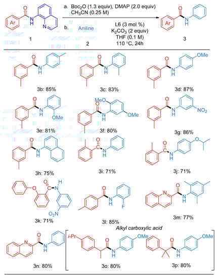 Our study was initiated using 3-methyl-N-(quinolin-8-yl)benzamide (1a) with aniline (2a) as model substrates for transamidation in the presence of different bases (Table 1). We started screening with well-developed phosphine ligands. Unfortunately, neither PPh3 nor PCy3 gave a product. The more σ-donating N-heterocyclic carbenes (NHCs) have revealed high efficiency in inert bond activation, such as C–O [88], C–F [89], as well as amide transformation reactions [63,65,70]. As expected, when using NHC ligands, the desired product was observed. With these promising results, several NHC ligands were examined for transamidation reactions (entries 3–9). Although the combination of Ni(COD)2 and SIPr (entry 9) showed a higher yield than (IPr)Pd(cinnamyl)Cl (entry 6), due to the significant difference of stability under air, we decided to use (IPr)Pd(cinnamyl)Cl as the catalyst, which was more user friendly [77]. A higher temperature was critical to improve the yield (entry 10). Neither the strong base sodium tert-butoxide (entry 12) nor the organic base 1,8-diazabicyclo[5.4. 0]undec-7-ene (DBU) (entry 13) enhanced the yield. Switching the reaction solvent from THF to MeCN, dioxane or DMF resulted in lower yields (entries 14–16). The control experiment showed that the Pd catalyst was indispensable (entry 17). Finally, we attempted a one-pot transamidation (entry 18) and found that there was no detriment to the yield. The separation of 1a and 4-dimethylaminopyridine (DMAP) was not needed, which enhanced the step efficiency and made the reaction greener.