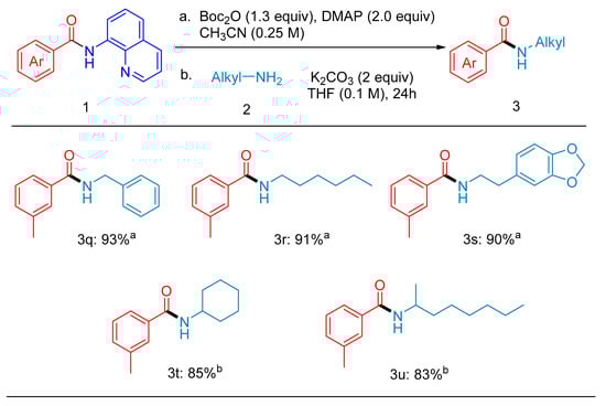 Next, we tried to expand the scope to aliphatic amines (Figure 3). The reaction took place without Pd catalysts, which was consistent with Szostak’s report [66,76]. For the primary amines, the reaction proceeded well even at room temperature (3p, 3q, 3r). For the secondary amines, although a higher temperature was required, the yield was still excellent (3s, 3t).