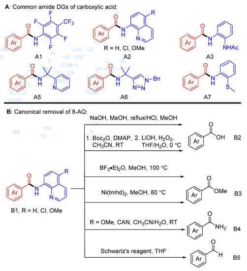 C–H functionalization has emerged as a powerful strategy for building-up new molecules [1,2,3,4]. In the past decades, the growing interest in C–H functionalization has led to increased attention to this paradigm for organic synthesis, which has inspired exceptional advances in this field [5,6,7,8]. The maneuver of directing groups (DGs) in C–H functionalization has been proved to be pivotal to facilitate the desired transformation. Common DGs include ketones [9,10,11], esters [12,13,14], carboxylic acid [15,16,17], amides [18,19,20,21,22], etc. Among them, amides are one of the most frequently used motifs (Scheme 1(A)). Taking advantage of its strong coordination with transition metals, a myriad of contributions have been made, especially with bidentate amide DGs. In 2005, Daugulis [23] introduced 8-aminoquinoline (8-AQ) A2 to C–H functionalization, which has been widely used in Pd- [24,25,26,27], Rh- [28,29,30], Ru- [31], Ni- [32,33,34,35,36,37,38], Cu- [39,40,41], Co- [42,43,44], and Fe-catalyzed [45,46,47,48] C–H activation to enable various reactions.