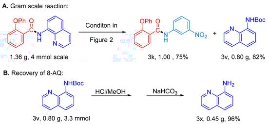 Finally, we scaled up the reaction to the gram scale (Scheme 2A) and found that the yield was consistent with the small-scale reactions. We also isolated the tert-butyl quinolin-8-ylcarbamate in 82% yield, from which the Boc deprotection can be removed quantitatively to recover the 8-AQ (Scheme 2B).