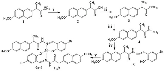 Compound 5, the Schiff base of hydrazide, was prepared as illustrated in Scheme 1. Briefly, sodium salt of naproxen was treated with HCl to form 2-(6-methoxynaphthalen-2-yl) propanoic acid and was subsequently converted to methyl 2-(6-methoxynaphthalen-2-yl) propanoate. The formation of ester was confirmed by the appearance of an IR absorbance peak at 1083.99 cm−1 for (OC−OCH3). Methyl ester, 3, was reacted with hydrazine to prepare the hydrazide, and then treated further with 5-Bromosalicylaldehyde to prepare the Schiff base ligand 5. The FTIR spectrum of the Schiff base shows peaks for (N−H) at 3226.91 cm−1 for (C=N) at 1658.78 cm−1, for (NC=O) at 1614.42 cm−1, for (Ar−OH) at 3541.31cm−1, for (C−O) at 1203.58 cm−1, for (Ar−OCH3) at 1271.09 cm−1, for (OH) at 3049.46 cm−1, and for (C−Br) at 623.01 cm−1. The compound 5 exhibits λmax at (C=N) 282.0 nm. The FTIR and UV data agree with the proposed structure of 5 [33,34,35,36].