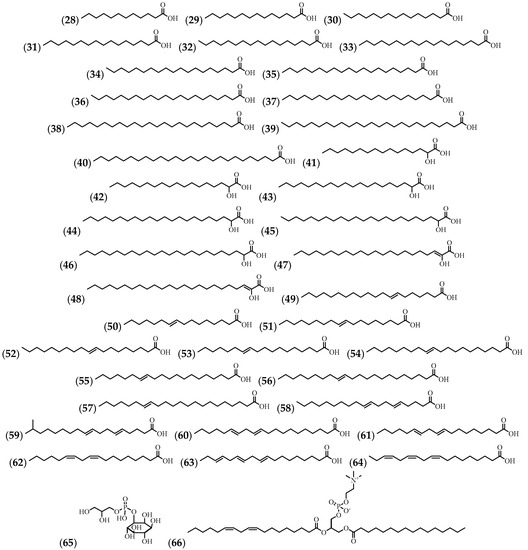 A fatty acid composition analysis resulted in the identification of 37 compounds and a compound of very unusual structure (59). Two phospholipids were also identified. The flowers, leaves, and stems were used for the isolation of these compounds (Table 3 and Figure 4).