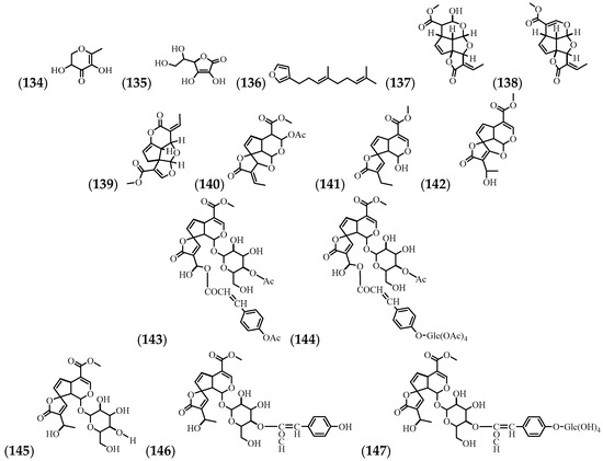 The mechanisms for recovering compound (145) from ethanol and ethyl acetate extracts have been established, with ethanol showing the greatest yield [64]. The most commonly used plant parts for the isolation and identification of compounds are flowers, roots, leaves, root bark, and bark (inner part) (Table 8 and Figure 9).