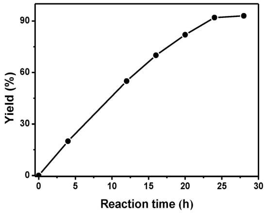 Effect of reaction time on the product yield over CuI and [P4444][Im]; Reaction conditions: 1a, 1.0 mmol, 2a, 1.0 mmol, CuI, 0. mmo, [P4444][Im], 0.1 mmol, CO2 (1 atm), 30 °C. The yield was isolated yield.
