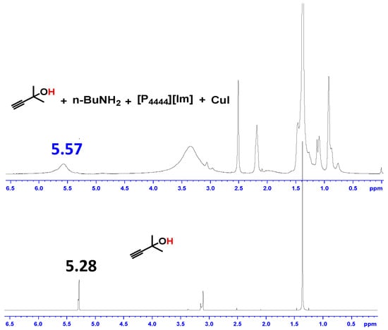 1H-NMR spectra of propargylic alcohol, n-BuNH2 with and without CuI/[P4444][Im] catalyst.