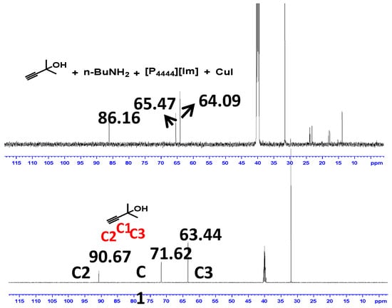 13C-NMR spectra of propargylic alcohol, n-BuNH2 with and without CuI/[P4444][Im] catalyst.