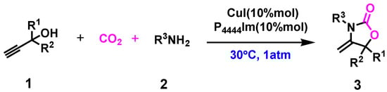 Our previous work has revealed that metal salts combined with ionic liquid (IL) represent a new hybrid catalyst that can be regarded as one of the most promising and efficient catalysts for chemical transformations of CO2 because of their remarkable synergistic catalysis mechanism [31]. For example, a Cu(I) salt/protic IL catalytic system can efficiently catalyze the cycloaddition of CO2 with propargylic alcohols to produce α-alkylidene cyclic carbonates under mild conditions. Inspired by these works, we now report that Cu(I) salt and the IL tetrabutylphosphonium imidazol([P4444][Im]) act as a catalyst for the three component reaction of terminal propargyl alcohols, CO2 and anines (Scheme 1). The results show that the CuI/[P4444][Im] catalyst system exhibits excellent catalytic performance for the reaction with a wide range of substrates under atmospheric pressure and room temperature conditions. In addition, the ionic liquid could be recovered and reused at least five times without an obvious loss of catalytic activity and selectivity.