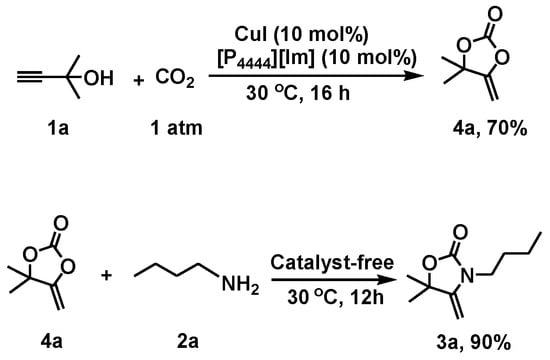 To gain insight into the reaction mechanism, the catalytic role of [P4444][Im]/CuI with CO2 and the substrates were elucidated by 1H-NMR and 13C-NMR spectroscopy. In the 1H-NMR spectrum of the mixture of [P4444][Im]/CuI with 1a and n-BuNH2 (Figure 3), the OH signal became broad and shifted from 5.28 to 5.57, which indicated the formation of a hydrogen bond between [P4444][Im] and 1a [35]. In addition, the 13C-NMR signal assigned to the C1, C2, and C3 sites could be attributed to the interaction between CuI with the C≡C bond, leading to the activation of propargylic alcohol (Figure 4). These analysis suggested that the -OH and C≡C bond on the substrate 1a were synergistically activated by [P4444][Im] and CuI. Moreover, several additional control experiments were performed and the results are shown in Scheme 2. It was shown that the CuI/[P4444][Im] catalyst could efficiently catalyze the reaction of 1a with CO2 to form cyclic carbonate 4a with a yield of 70%. In addition, 4a reacted with n-butylamine to afford 3a smoothly without any catalyst. Therefore, the reaction of propargylic alcohols, anines and CO2 can be assumed to go through the cyclic carbonate pathway [37].