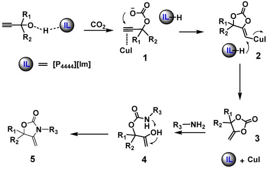 Based on the above results, a plausible mechanism for the reaction catalyzed by CuI/[P4444][Im] as depicted in Scheme 3 is proposed. Firstly, the hydroxyl group of the propargyl alcohol is activated by IL [P4444][Im], then it reacts with CO2 to generate a zwitterionic carbamate species 1. Meanwhile, the C≡C triple bond of the propargyl alcohol was activated by CuI, and then the intermediate 2 was obtained. Then the intermediate cyclic carbonate 3 was formed by an intramolecular ring-closing reaction with the release of the catalyst. Finally, the cyclic carbonate undergoes a nucleophilic attack by a primary amine to generate the product oxazolidinone 5.