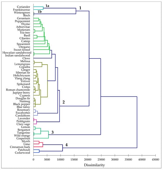 | Citrus × bergamia Risso & Poit. (bergamot) | dōTERRA | 59.2 ± 6.3 | 44.9 ± 1.6 | 1 | Unspecific |