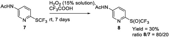The application of this method to heterocyclic thioethers is highly challenging, as demonstrated by the two following preliminary results. Thus, 2-trifluoromethylsulfenyl-5-acetylamino-pyridine 7 was oxidized to sulfoxide 8 with low conversion after seven days stirring, and we failed to separate the product from the starting sulfide (Scheme 4). A study devoted to the oxidation of heterocyclic substrates is needed but falls outside the scope of the present study.