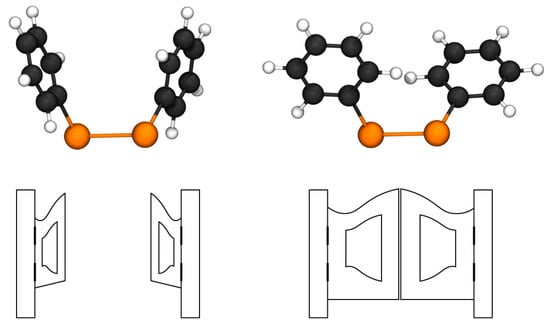 Fully optimized conformers of Ph2Te2, namely open (left) and closed (right); the corresponding open and closed doors are sketched below. Level of theory: ZORA-OPBE/TZ2P.