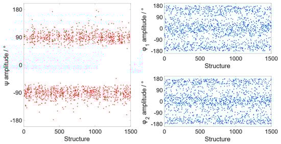 Values of the Ψ (left) and Φ1,2 (right) dihedral angles for the structures extracted from the MD simulation.