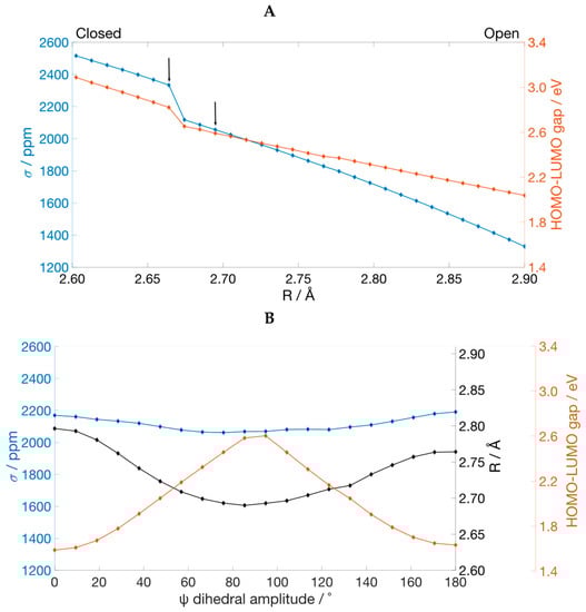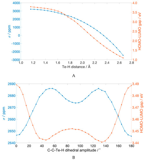 Upon stretching the Te–H bond, σ(125Te) decreases when going from the equilibrium value (1.66 Å) to 2.66 Å, i.e., the value changes from 2647.7 ppm to −2455.6 ppm (Figure 4A). This last value, when decomposed, results in a σd of 5389.6 ppm and a σp of −7843.2 ppm. Comparing these values to those of the equilibrium structure, it is clear that the paramagnetic part is responsible for the decrease of the σ(125Te). The decomposition of σp confirmed that the stretching of the Te-H bond enhances those terms arising from the occupied orbitals and the LUMO, as the energy of this anti-bonding orbital decreases with increasing Te–H distance (Figure 4A). Focusing on the largest contribution to σp—i.e., the one arising from the HOMO–LUMO pair (Figure 3B), the term σpocc-virt changes from −891.4 ppm in the relaxed structure to −4998.8 ppm in the deformed geometry, while the energy gap between the two molecular orbitals shrinks from 3.49 to 1.10 eV.
