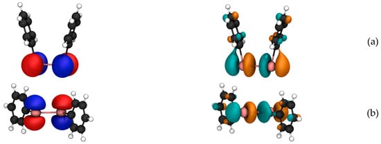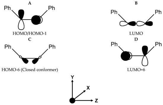 For Ph2Te2, we decomposed the 125Te σ of both conformers into its diamagnetic and paramagnetic contributions. The results confirmed that σd changes only slightly for the two conformers—i.e., 5387.2 ppm for the closed conformer and 5388.5 ppm for the open one—and is almost identical to that computed for PhTeH, i.e., 5385.6 ppm. On the other hand, σp is appreciably different in the two conformers—i.e., −3495.1 ppm for the open one and −2990.7 ppm for the closed one. The decomposition of σp showed that the sum of all the σpocc-virt is slowly converging as for PhTeH. In addition, the multitude of terms makes it difficult to outline distinctive features that differentiate the chemical shifts. Therefore, we focused on the most relevant contributions. Particularly, we first addressed the σpocc-virt ascribed to the HOMO–LUMO pair, which has the smaller energy gap (3.05 eV in the closed conformer and 2.72 eV in the open conformer) and should therefore provide a substantial contribution to σp. We found that in both conformers these terms are similar and represent approximatively 10% of the total σp, i.e., −327.9 ppm (first Te nucleus) and −324.9 ppm (second Te nucleus) in the closed conformer, and −300.7 ppm (identical in each Te nucleus) in the open one. The HOMOs of both molecules display strong and either px or py atomic orbital character on the Te nuclei (Figure 5A). Conversely, the LUMOs have net Te pz atomic character. Either By or Bx field components will rotate the px or py to pz, thus leading to a non-null overlap integral with the LUMO. The component of the applied magnetic field is important for the evaluation of the integral in Equation (2) (see Materials and Methods): due to the mutually orthogonal nature of the p orbitals on the Te nuclei in the HOMO, the use of By or Bx determines a strong magnetic coupling only on one of the two chalcogens.