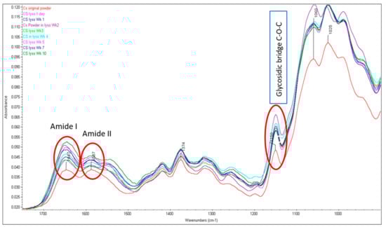 FTIR spectra of CS powders before and after lysozyme treatment (characteristic peaks for amide I, II and glycosidic bonds are highlighted).