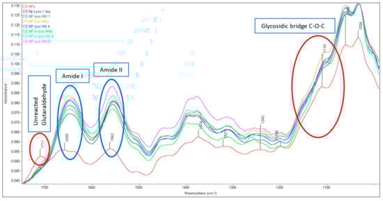The FTIR spectra of CS NPs formed by crosslinking with glutaraldehyde are presented in Figure 1. The glutaraldehyde crosslinked CS produced three prominent peaks i.e., a sharp peak at 1562 cm−1, a wide peak at 1659 cm−1 (with a little shoulder peak at 1641 cm−1) and another sharp peak 1711 cm−1. It is well known that the glutaraldehyde reacts with the amine group of CS and a stable imine (C=N) group (Schiff base) is formed []. The amino groups of CS then catalyze the aldol condensation/polymerization reaction favoring the formation of irregular oligomeric products with aldehyde groups that further react with other amino groups available in the nearby CS unit [,]. According to the explanation by Liu et al. [] the peak appearing at 1562 cm−1 may be considered as a C=C stretch confirming the aldol condensed oligomer; the very weak peak (little shoulder) at 1641 cm−1 is associated with the Schiff base (C=N), the wide peak at higher wavenumber 1659 cm−1 is also considered as a C=N stretch; however, in a non-conjugated form; and a low peak at 1711 cm−1 is considered as the carbonyl (C=O) band from unreacted aldehyde groups. The specific band stretching of amide I (C=O) band and amide II (NH) at 1647 cm−1 and 1587 cm−1, respectively, observed in the original CS spectrum, are either absent or convoluted with others (as demonstrated above) in the crosslinked CS nanoparticles [,]. Although the nanoparticles were washed with diethyl ether and water to remove excess glutaraldehyde, the absorption band at 1711 cm−1 indicated the presence of non-reacted aldehyde group of the crosslinker glutaraldehyde []. All of the CS NPs incubated in 0.2 mg/mL lysozyme solution up to week 10 were subjected to the FTIR analysis (Figure 3). The characteristic FTIR peak initially observed at around 1711 cm−1 appeared as a weak band after one day and completely disappeared after one week of lysozyme treatment. The actual reason behind this is not clear. Interestingly, no broad peaks initially appearing at 1659 cm−1 for the untreated CS NPs were observed after lysozyme treatment; however, two sharp peaks (1554–1558 cm−1 and 1644–1656 cm−1) were observed in all NPs incubated in 0.2 mg/mL lysozyme solution up to 10 weeks. The characteristic peak at 1150 cm−1 associated with the C-O-C bridges observed for original CS, was not apparent at 1150 cm−1 for NPs. This peak was suggested to be shifted to 1110 cm−1 (prominent peak) and representing the C-O-C bridge in NPs (Figure 1). The peaks around 1110 cm−1 (although a little bit weak) for all NPs were seen after lysozyme treatment meaning very insignificant breakdown of the glycosidic bond by lysozyme had occurred at the surface level. The observed sharp peaks between 1060–1032 cm−1 represented the O-C-O ring of the CS, was unaffected by the lysozyme during 10 weeks incubation. These peaks are nearly the same as observed in the original CS and the crosslinked NPs.