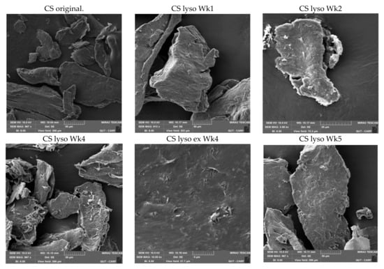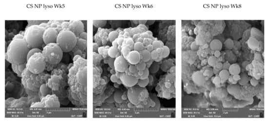 A phosphate buffered saline (PBS) tablet (Sigma Aldrich) was dissolved in 200 mL milliQ water and the pH was measured immediately after preparation. Using the prepared PBS solution, a 0.2 mg/mL lysozyme (pH 7.4) solution was produced as this concentration of lysozyme is the maximum level available in human tracheobronchial secretions) []. Suspensions of CS powder and CS NPs in the prepared PBS solution (1.0 mg/mL) were prepared and sonicated for 5 min. All samples were clamped with an orbital shaker at 50 rpm and incubated at 37 °C. The pH of the suspensions was measured weekly and fresh lysozyme solution was added once per week []. The suspensions were centrifuged at 14,000 rpm for 4 min, the supernatant was removed and the pellet was washed with deionized water (×3). The samples were freeze-dried at −80 °C for 24 h and subjected to ATR-FTIR and SEM scanning.