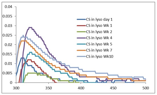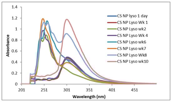 The CS nanoparticles in lysozyme solution incubated at 37 °C showed similar UV-Vis spectra (Figure 10) (except Wk 6 sample, which showed only one sharp peak at 246 nm). Samples incubated for 24 h and seven days showed significant peaks between 298–301 nm, which might be considered as the initial breakdown of CS in a short time. Samples of Wk 4, Wk 7, Wk 8, and Wk 10 showed the right shifting of their first peaks with similar sharp peaks between 298–301nm (Figure 10), which might be considered as a sign of subsequent NPs degradation in lysozyme solution after 3 weeks.