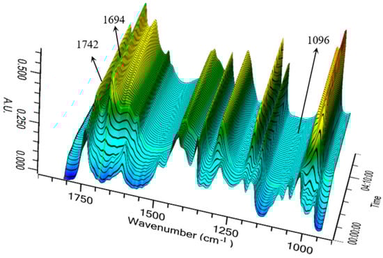 Operando attenuated total reflection infrared (ATR-IR) spectroscopy has been demonstrated as a powerful method to monitor real-time chemical reactions [28].To explore the oxidation process catalyzed by Zn(NO3)2/VOC2O4, oxidation of methyl DL-mandelate was monitored by online ATR-IR (Figure 1). The bands at 1694 and 1742 cm−1 were assigned to C=O stretching vibrations of carbonyl (methyl phenylglyoxylate) and esters functional group, respectively. The band at 1096 cm−1 was assigned to C-O stretching vibration of methyl DL-mandelate [29]. The signal at 1694 cm−1 rose gradually in the beginning, while the peak height at 1096 cm−1 (C-O stretching vibration of methyl DL-mandelate) diminished. Methyl DL-mandelate was converted to methyl phenylglyoxylate, and no other significant intermediates were detected by ATR-IR during the oxidation reaction. Moreover, the peaks at 1742 and 1694 cm−1 remained stable as the reaction time prolonged, and no other significant signals appeared, indicating that few byproducts were generated under such oxidative conditions. These observations were in accordance with GC analysis (Table 1).
