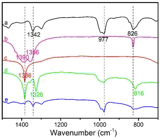 To explore the different catalytic activities of nitrates, we selected Zn(NO3)2 and Fe(NO3)3 to study the interaction of catalyst components using FT-IR. The reaction of Zn(NO3)2 or Fe(NO3)3 with VOC2O4 was carried out in acetonitrile without methyl DL-mandelate (80 °C, 0.2 MPa O2, 1.5 h). After the pre-treatment, a red brown powder was obtained after removing acetonitrile. The FT-IR spectra are presented in Figure 2. For the FT-IR spectrum of VOC2O4 (Figure 2, Line a), the band at 977 cm−1 was attributed to be characteristic of V=O stretching vibration and the 826 cm−1 band was due to O-C=C bending and M-O stretching vibration [30]. The shoulder bands at 1390 and 1356 cm−1 were assigned to N-O stretching vibrations of Zn(NO3)2 (Figure 2, Line b), while the sharp band at 1386 cm−1 was attributed to N-O stretching vibration of Fe(NO3)3 (Figure 2, Line c) [31]. It should be noted that the FT-IR spectrum of reaction mixture derived from Zn(NO3)2/VOC2O4 (Figure 2, Line d) was quite different from those of VOC2O4 or Zn(NO3)2 (Figure 2, Lines a and b). Two new bands at 1326 and 816 cm−1 (Figure 2, Line d) appeared while no similar new absorption bands were generated when VOC2O4 was reacted with Fe(NO3)3 under the same reaction conditions (Figure 2, Line e). These results suggest that the reaction mixtures derived from Zn(NO3)2 and Fe(NO3)3/VOC2O4 were quite different, especially the form of nitric species. These phenomena may be related to the generation of different NOx gases, which might account for catalytic activity difference by using Zn(NO3)2 or Fe(NO3)3 with VOC2O4, respectively.