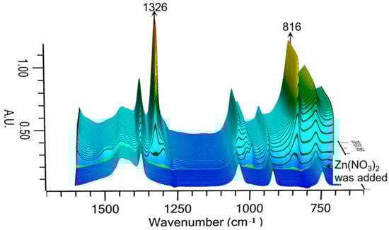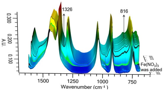 The observation above was further confirmed by investigating the interaction of Zn(NO3)2 or Fe(NO3)3 with VOC2O4 using online ATR-IR (Figure 3). Firstly, in the absence of substrate, VOC2O4 was stirred at 80 °C in acetonitrile under an oxygen atmosphere, and no apparent variation of spectrum was observed. This observation suggests that VOC2O4 alone remained stable under oxidative reaction conditions. When Zn(NO3)2 was introduced, new bands at 1326 and 816 cm−1 were generated simultaneously (Figure 3, top). On the contrary, when Fe(NO3)3 was added under the same reaction conditions, the ATR-IR spectrum (Figure 3, bottom) was distinct from that derived from Zn(NO3)2/VOC2O4. The bands at 1326 and 816 cm−1 were not observed (Figure 3, bottom). The online ATR-IR results were in good agreement with FT-IR results (Figure 2). These results demonstrated that different nitric species occurred in liquid phase by adding Zn(NO3)2 or Fe(NO3)3 under such oxidative conditions. This difference might be associated with the generation of NOx gases. It might account for lower catalytic activity for Fe(NO3)3 than that of Zn(NO3)2.