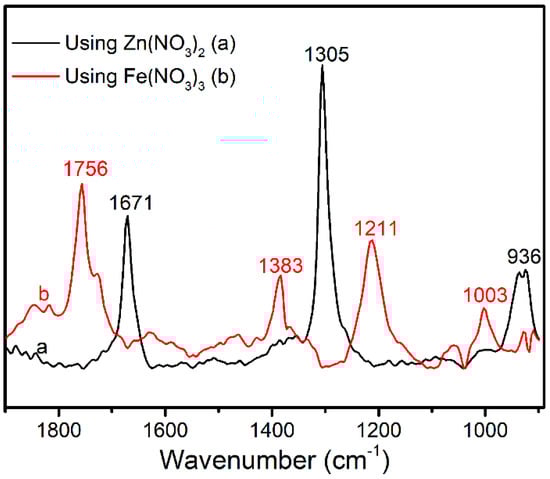 To verify the hypothesis mentioned above, we employed ATR-IR spectroscopy to detect composition of the gas phase, which was generated from the reaction of Zn(NO3)2/VOC2O4 or Fe(NO3)3/VOC2O4 (Figure 4). Firstly, Zn(NO3)2/VOC2O4 was stirred without the substrate under an oxygen atmosphere at 80 °C. In these experiments, the React IR™ 15-diamond probe was immersed in gas phase rather than liquid phase. The ATR-IR spectrum of gas phase demonstrated that new species which IR bands at 1671, 1305 and 936 cm−1 generated were attributable to HNO3 vapor (Figure 4, Line a) [32]. This observation suggests that HNO3 vapor probably was involved as one of key components during the oxidation using Zn(NO3)2/VOC2O4. In contrast, when the gas derived from Fe(NO3)3/VOC2O4 was monitored under the same conditions, IR bands at 1756, 1383, 1211 and 1003 cm−1 were detected. These bands were related to N2O3 and N2O4 mixture gas (Figure 4, Line b) [33,34], which were quite different from those derived from Zn(NO3)2/VOC2O4 (Figure 4, Line a). All these results above indicate that different NOx gases were involved during catalytic oxidation using Zn(NO3)2/VOC2O4 or Fe(NO3)3/VOC2O4. The obvious difference in NOx gases generated by using Zn(NO3)2/VOC2O4 or Fe(NO3)3/VOC2O4 was further investigated.