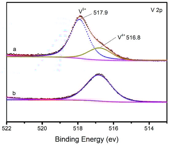 V 2p XPS spectra of the reaction mixture: V 2p XPS spectra of the Zn(NO3)2/VOC2O4 reaction mixture (a); and V 2p XPS spectra of the Fe(NO3)3/VOC2O4 reaction mixture (b).