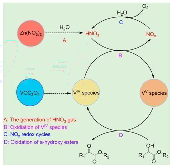 Plausible reaction mechanism for Zn(NO3)2/VOC2O4 catalyzed aerobic oxidation of α-hydroxy esters.