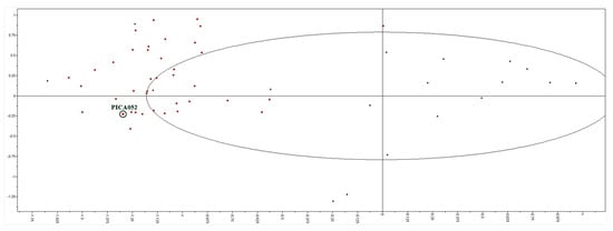 Partial least squares (PLS) scores of 39 candidate molecules (red dots) and training set (black dots). The best candidate compound, 2, is marked (PICA052).