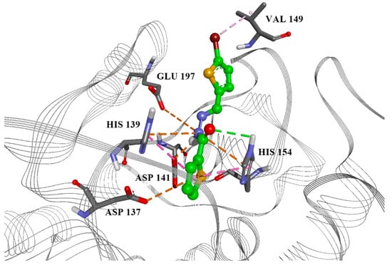 Regarding structure–activity relationships, the replacement of a thiophene group (compound 4) by a pyridine group (compound 5) was responsible for a loss of activity by a factor of five and also a strong reduction of cytotoxicity. Among the tested compounds, one compound, 2, is the most active despite having a not negligible toxicity. Its chemical structure has two thiophene groups. The replacement of a thiophene group (compound 2) by a furan group (compound 3) led to a total loss of activity and cytotoxicity. The replacement of the bromothiophene group (compound 2) by a benzothiazole group (compound 4) was responsible for a five-fold reduction of the anti-leishmanial activity and four-fold reduction of cytotoxicity. The replacement of bromothiophene (compound 3) by a methylbenzothiazole group (compound 1) enhanced both the antileishmanial activity and cytotoxicity. In the phenotypic based screening, the most promising compound 2 (Table 3) has an IC50 value of 2.18 µM, 20 times higher than that of amphotericin B, the reference compound. Regarding the selectivity index (SI) values, compound 2 has an SI of 2, whereas amphotericin B had an SI of 48 against Leishmania axenic amastigotes. It is also less than four times higher than the reference drug miltefosine (0.31 µM) []. The obtained in vitro results clearly require additional pharmacomodulations to reduce the cytotoxicity and enhance the antileishmanial activity in order to achieve better selectivity index values.