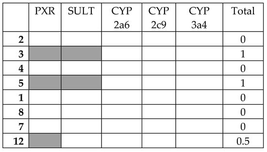 Interaction matrix between proposed ligands and anti-targets. Color code: black = 1.0; grey = 0.5, white = 0.0. Columns: PXR = pregnane-X-receptor; SULT = sulfotransferase; CYP 2a6 = cytochrome P450 cam 2a5; CYP 2c9 = cytochrome P450 cam 2c9; CYP 3a4 = cytochrome P450 cam 3a4; Total = PXR + SULT + CYP 2a6 + CYP 2c9 + CYP 3a4.