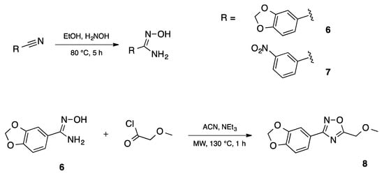 Synthesis of the 3-[3,4-(methylenedioxy)phenyl)]-5-(methoxymethyl)-1,2,4-oxadiazole 8 was achieved in two steps and 90% total yield by the reaction of 3,4-(methylenedioxy)benzonitrile with hydroxylamine to afford quantitatively amidoxime 6 followed by the reaction with methoxyacetyl chloride under microwave irradiation (Scheme 2). This compound was prepared during a small molecule library synthesis program, and the protocols established to allow the automation and the parallelization of reactions. The first step of the procedure was applied to 3-nitrobenzonitrile, affording also in quantitative yield the corresponding 3-nitrobenzamidoxime.