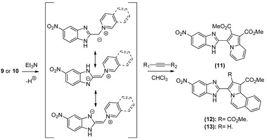 The 1,3-dipolar cycloaddition reaction of azomethine ylide containing nitrogen in a 6-membered ring such as pyridine and isoquinoline was applied for the synthesis of the target compounds. In that respect, 1-((5-nitro-1H-benzo[d]imidazol-2-yl)methyl)pyridin-1-ium chloride 9 and 2-((5-nitro-1H-benzo[d]imidazol-2-yl)methyl)isoquinolin-2-ium chloride 10(2), (Scheme 3), which were prepared from the reaction of pyridine/isoquinoline with 2-(chloromethyl)-5-nitro-1H-benzo[d]imidazole (Scheme 3), as described previously [,], undergo a dehydrohalogenation reaction in the presence of triethylamine in chloroform to give the corresponding pyridinium 9/isoquinolinium 10 ylide in 75% and 95% yield, respectively. The reaction of the latter (Scheme 4) with DMAD or methyl propiolate at room temperature and overnight afforded, after workup and column chromatography, the indolizine 11 (25% yield), and benzindolizines 12 and 13 (28% and 27%, respectively). The obtained compounds were fully characterized by 1H, 13C NMR, mass spectra, and IR.