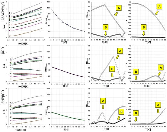 Values of non-linear regression coefficients and determination coefficient (r2) for the equation in the form lnk = ax2 + bx+ c (where x = 1000/T) for substances chromatographed on a 10 cm LC-18 column and mobile acetonitrile/water phases (35%, v/v) without a macrocyclic modifier and with the addition of β-cyclodextrin and hydroxypropyl-β-cyclodextrin, calculated on the basis of the data presented in Table 1.