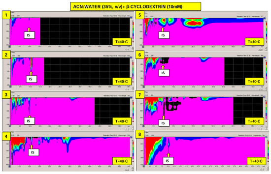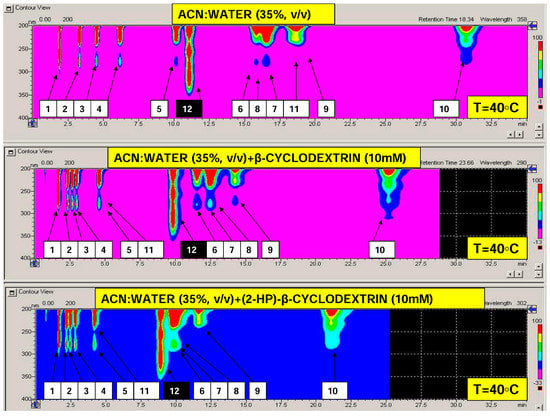 The approximate elution times of analytes, within temperatures ranging from 0 to 60 °C (with step 1 °C) together with the calculated optimization parameters profiles are visualized in Figure 1. With reference to total analysis time and considering the whole set of target analytes, elevated temperature region for the efficient separation of bisphenols may be preferred. Examples of isocratic separation performed at 40 °C and using different mobile phase additives are presented in Figure 2. As can be seen, baseline separation of selected bisphenols can be obtained and the retention time reduced using cyclodextrin additives. However, for efficient separation of the given bisphenols mixtures e.g., containing bisphenol Z (No 11), a subambient temperature region should be selected, if cyclodextrin modified phases are applied. In such cases, the total analysis time can be significantly reduced in comparison with plain acetonitrile–water mobile phase. It should be highlighted that using the isocratic systems studied, bisphenol AP (No 7) and bisphenol BP (No 8) cannot be separated, regardless of the mobile phase additive and temperature (Figure 1 and Figure 2). For such components of interest, a different concentration of cyclodextrins, macrocyclic additive type, acetonitrile % or gradient elution system should be tested and applied.