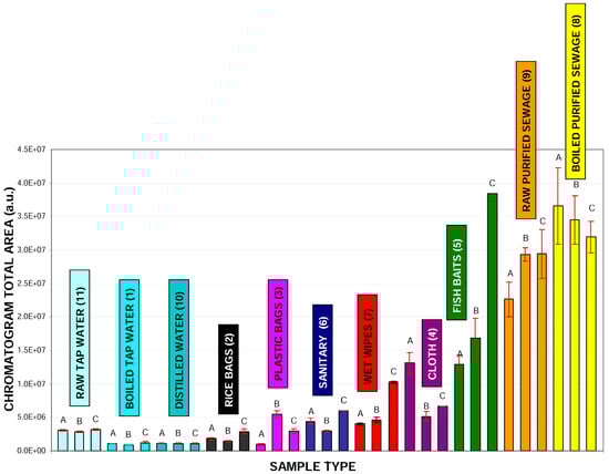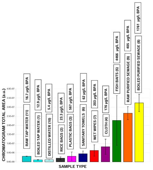 Integrated areas of all detected peaks on chromatograms (detection at 280 nm) calculated for various samples, which were prepared accordingly to our analytical protocol. Boxes above each material type indicate the calculated value of bisphenol A detected within each sample. Samples labeling: raw distilled water (10), raw tap water (11), boiled tap water (1), rice bags (2), various plastic bags (3), plastic fishing baits (5), various dust cloth (4), sanitary towels (6), raw purified sewage (9) boiled purified sewage (8) wet wipes (7). Numbers in parentheses are related to chromatograms numbers presented in Figure 3 and Figure S2.