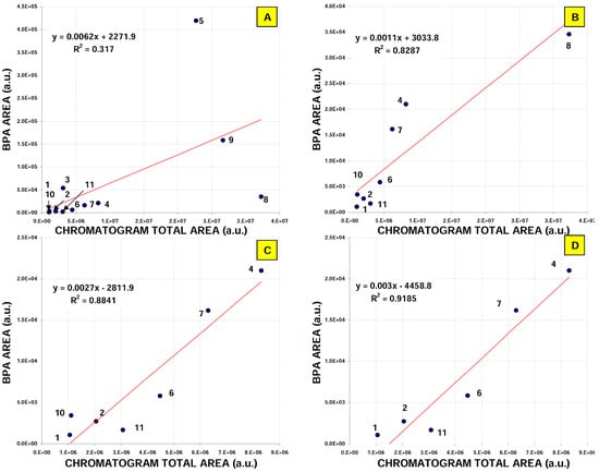 Correlation observed between SPE extracts contents (the total peaks area on UV-DAD chromatograms) and the bisphenol A peak area for each extracted material. Sample labelling: (A). all tested materials; (B). without samples 3, 5 and 9; (C).without samples 3, 5, 9 and 8; (D). without samples 3, 5, 9, 8 and 10. Dots numbers corresponds to material types listed in Table 5 and Table 6.