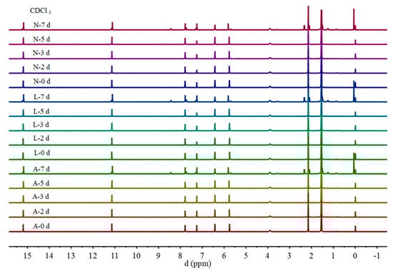 1H NMR spectrum of the gossypol in chloroform-d under different storage conditions over time (N: normal condition without protecting from air and light; L: under natural light and nitrogen protection; A: stored in dark and under nitrogen protection).