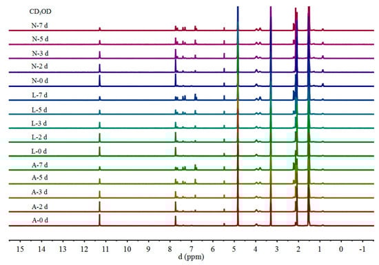1H NMR spectrum of the gossypol in methanol-d4 under different storage conditions in different days (N: normal condition without protecting from air and light; L: under natural light and nitrogen protection; A: stored in dark and under nitrogen protection).