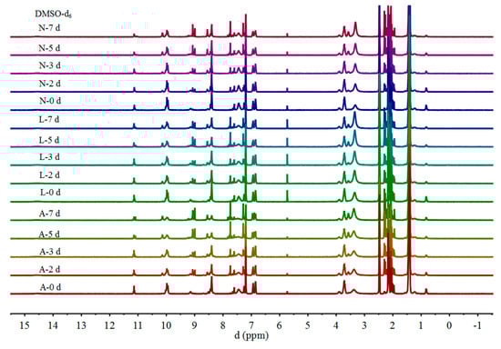 1H NMR spectrum of the gossypol DMSO-d6 solution under different storage conditions in different days (N: normal condition without protecting from air and light; L: under natural light and nitrogen protection; A: stored in dark and under nitrogen protection).
