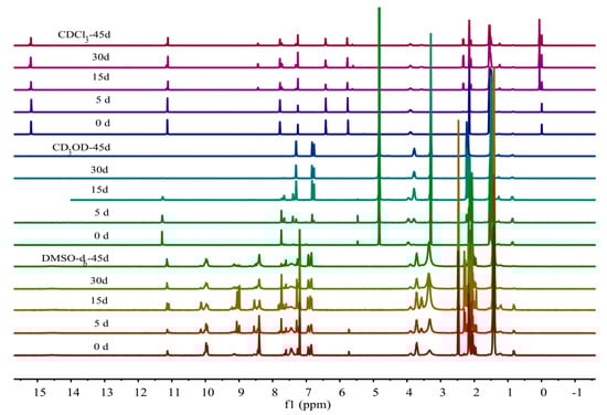 According to the 1H NMR spectra, no chemical decomposition had taken place for gossypol stored in different solvents within five days. The signal changes were proposed to be the tautomeric transformation of gossypol. Additional experiments were carried out. The 1H NMR spectra of gossypol were obtained in three solvents (CHCl3, DMSO, and CH3OH) after 45 days.