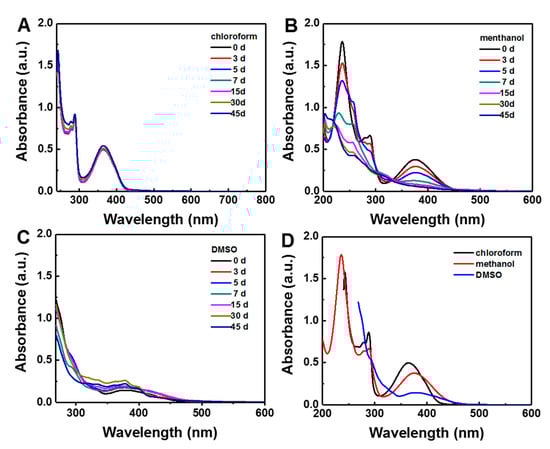 UV-vis spectra of the gossypol solution for different days (c = 0.025 mmol·L−1): (A) gossypol CHCl3 solution; (B) gossypol CH3OH solution; (C) gossypol DMSO solution; and (D) the absorption curve of gossypol in each solvent.