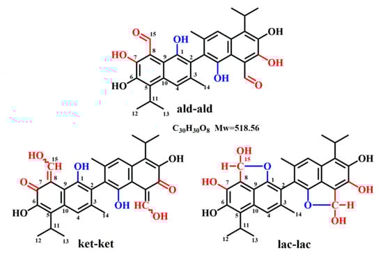 The 1H NMR spectrum of gossypol in different solvents over time showed that the tautomeric form had fundamental influences on gossypol instability. However, their prevalence and importance remained elusive, because they were found to exist only transiently [37,38]. Indeed, the different tautomeric form was also believed to be in equilibrium with each other in the fluid state [39,40,41,42].