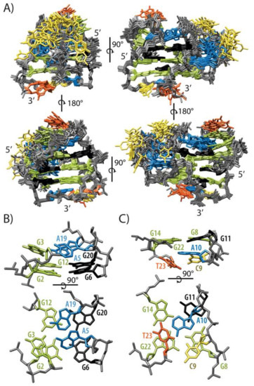 - Dickerhoff, J.; Weisz, K. Flipping a G-Tetrad in a Unimolecular Quadruplex without Affecting Its Global Fold. Angew. Chem. Int. Ed. 2015, 54, 5588–5591. [Google Scholar] [CrossRef] [PubMed]