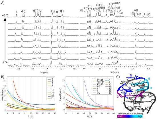 Spectral changes of HPV51(1–4) as a function of temperature. (A) Imino and aromatic regions of 1D 1H spectra in 5 °C steps from 0 to 40 °C. (B) Temperature dependency of signal width at half-height of imino (left) and aromatic and methyl protons (right). To estimate contributions other than change of temperature and viscosity the minimal line broadening observed at certain temperature has been subtracted from measured values for specific residues. (C) Structure of HPV52(1–4) with coloured residues displaying line-broadening above 10 and 15 Hz for imino and aromatic protons, respectively.