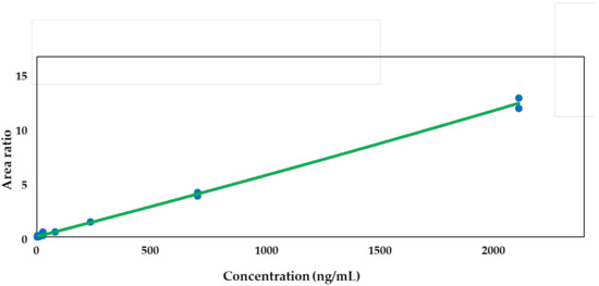 Method qualification was carried out with a “fit-for-purpose” approach. The qualification run contained duplicate standards with eight concentrations and QCs with three levels of concentrations. The acceptance criteria for standards and QCs in the qualification run were within ±25% precision and accuracy. A calibration curve was made by establishing the quadratic regression function with the equation y = ax2 + bx + c after 1/concentration2 weighting. In addition, two blank plasma samples were run.