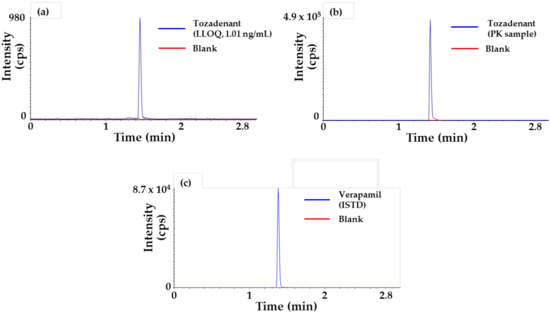 Representative chromatograms of tozadenant [lower limit of quantification (LLOQ), 1.01 ng/mL] and verapamil (ISTD) samples are also shown in Figure 2.